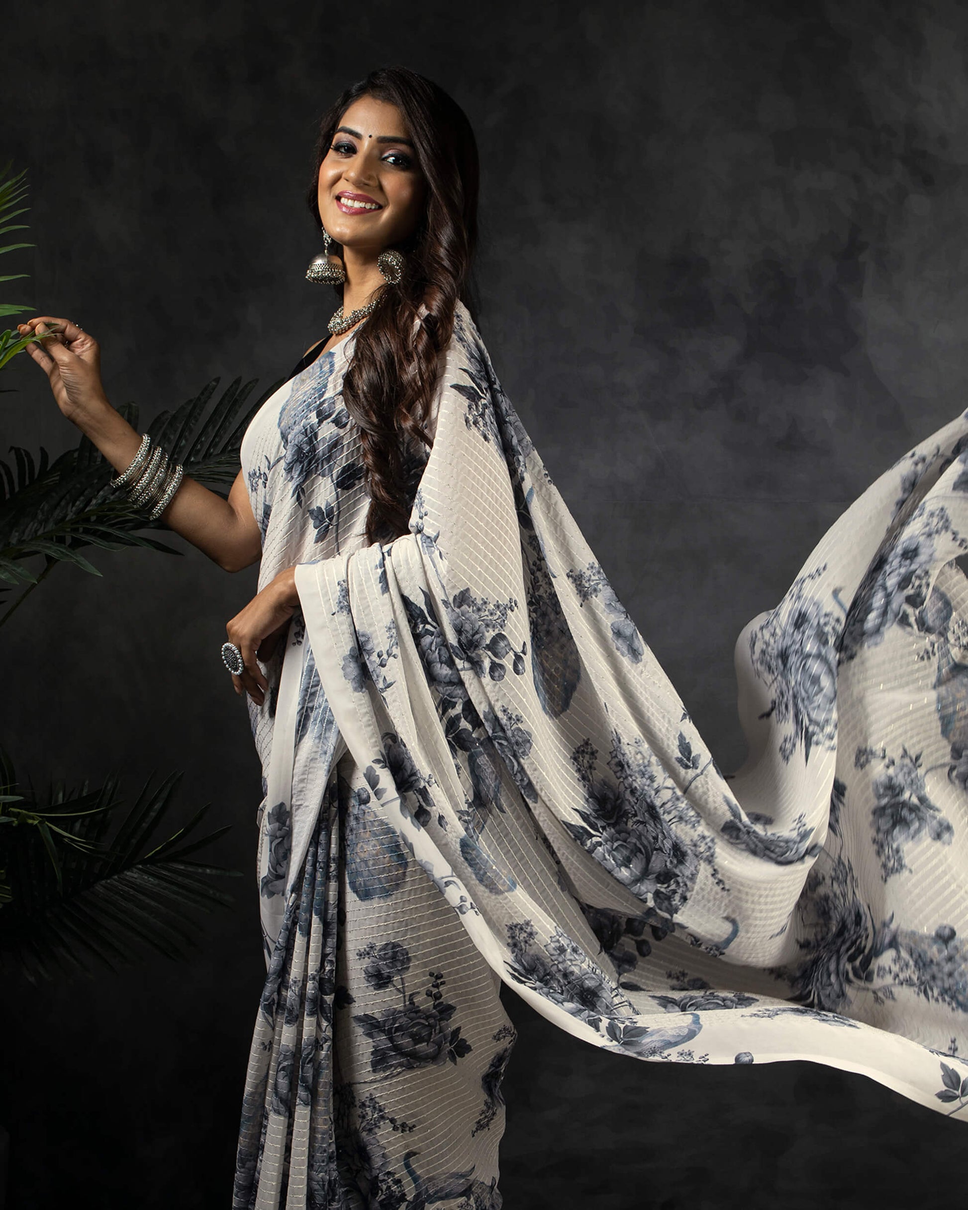 Oat Beige And Dolphin Grey Peacock Feather Pattern Premium Sequins Georgette Saree With Tassels