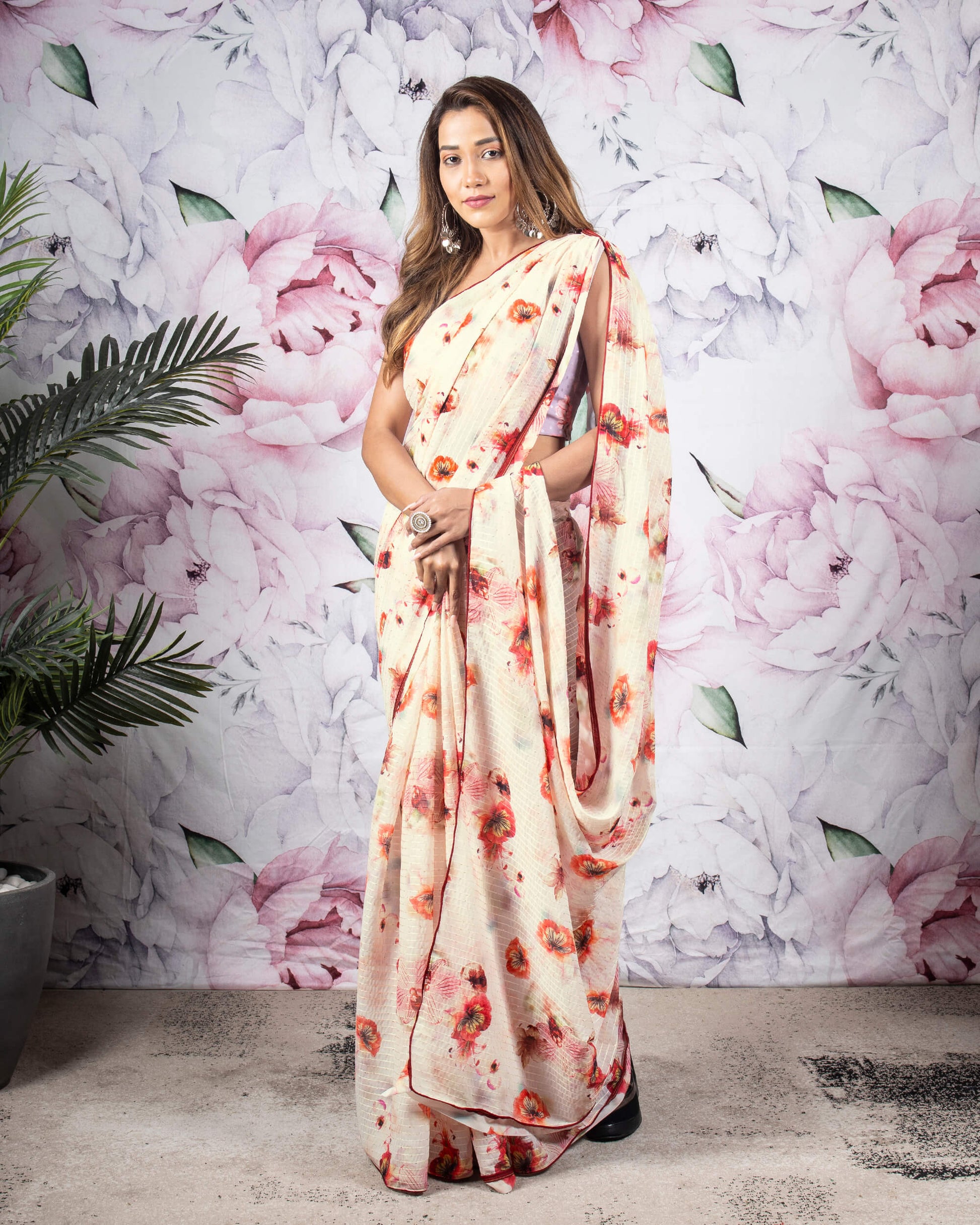 Oat Beige And Red Floral Pattern Sequins Georgette Saree With Satin Border