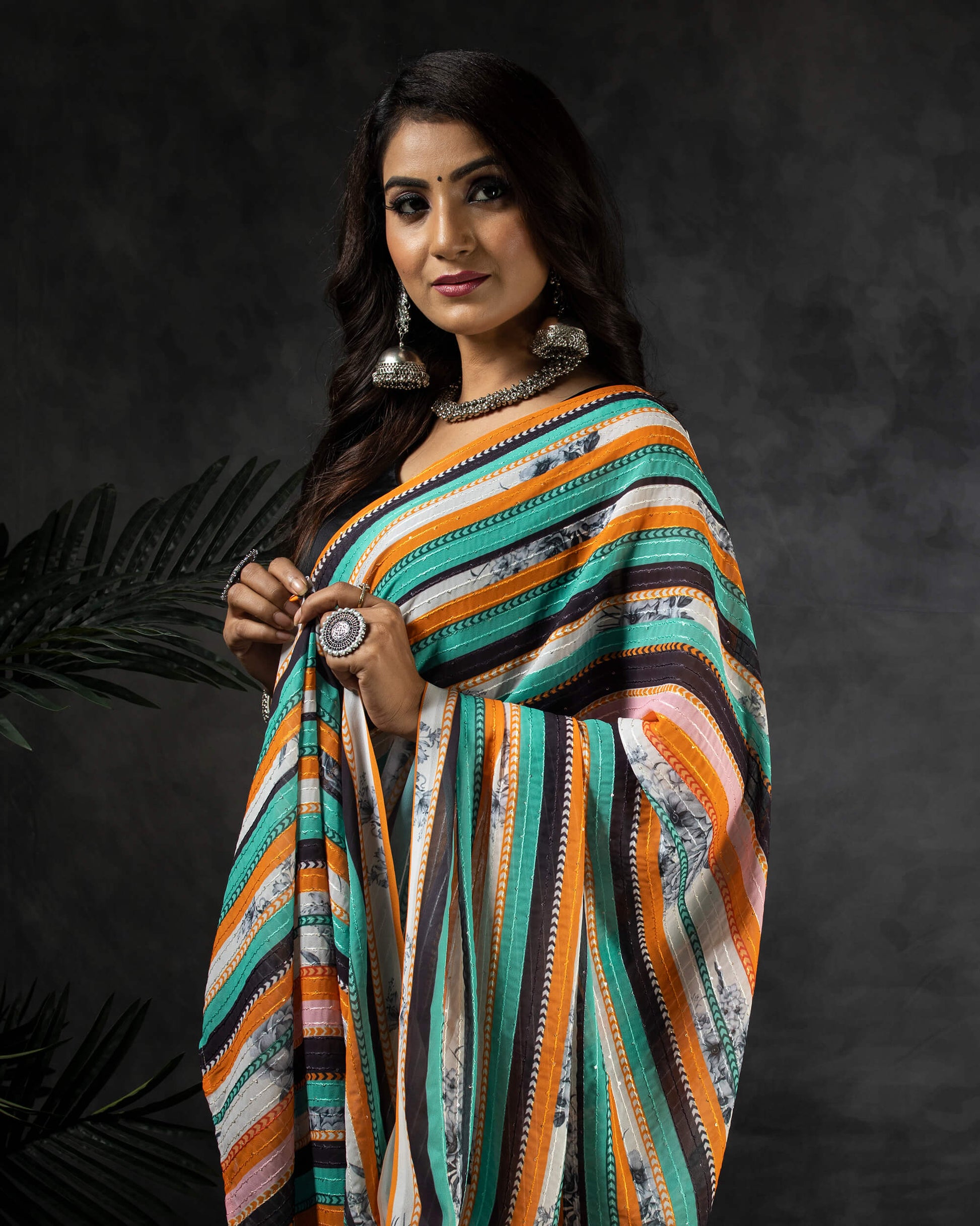 Ocean Green And Carrot Orange Stripes Pattern Premium Sequins Georgette Saree With Tassels