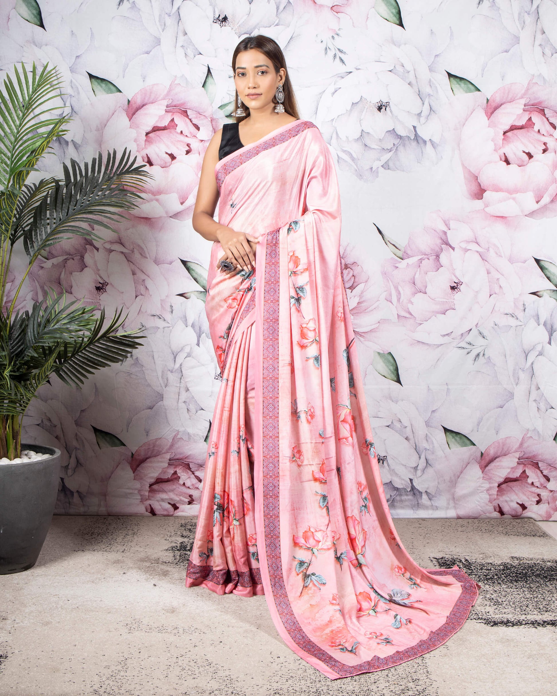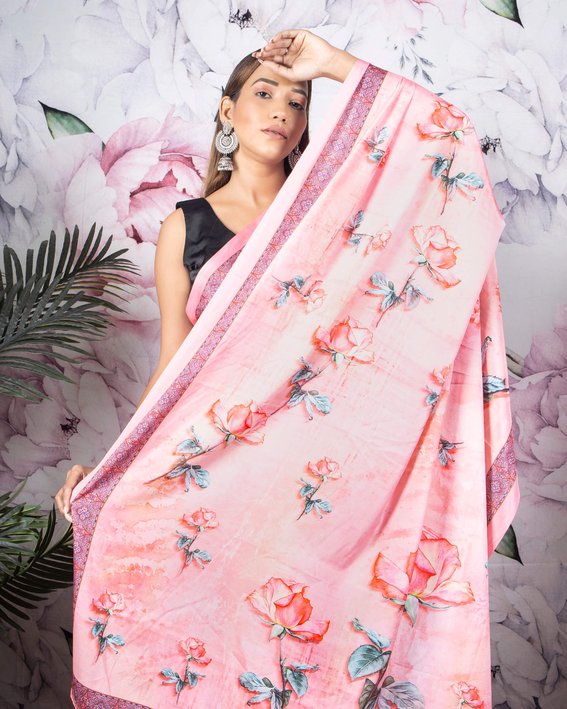 Pink And Green Floral Pattern Digital Print Crepe Silk Saree