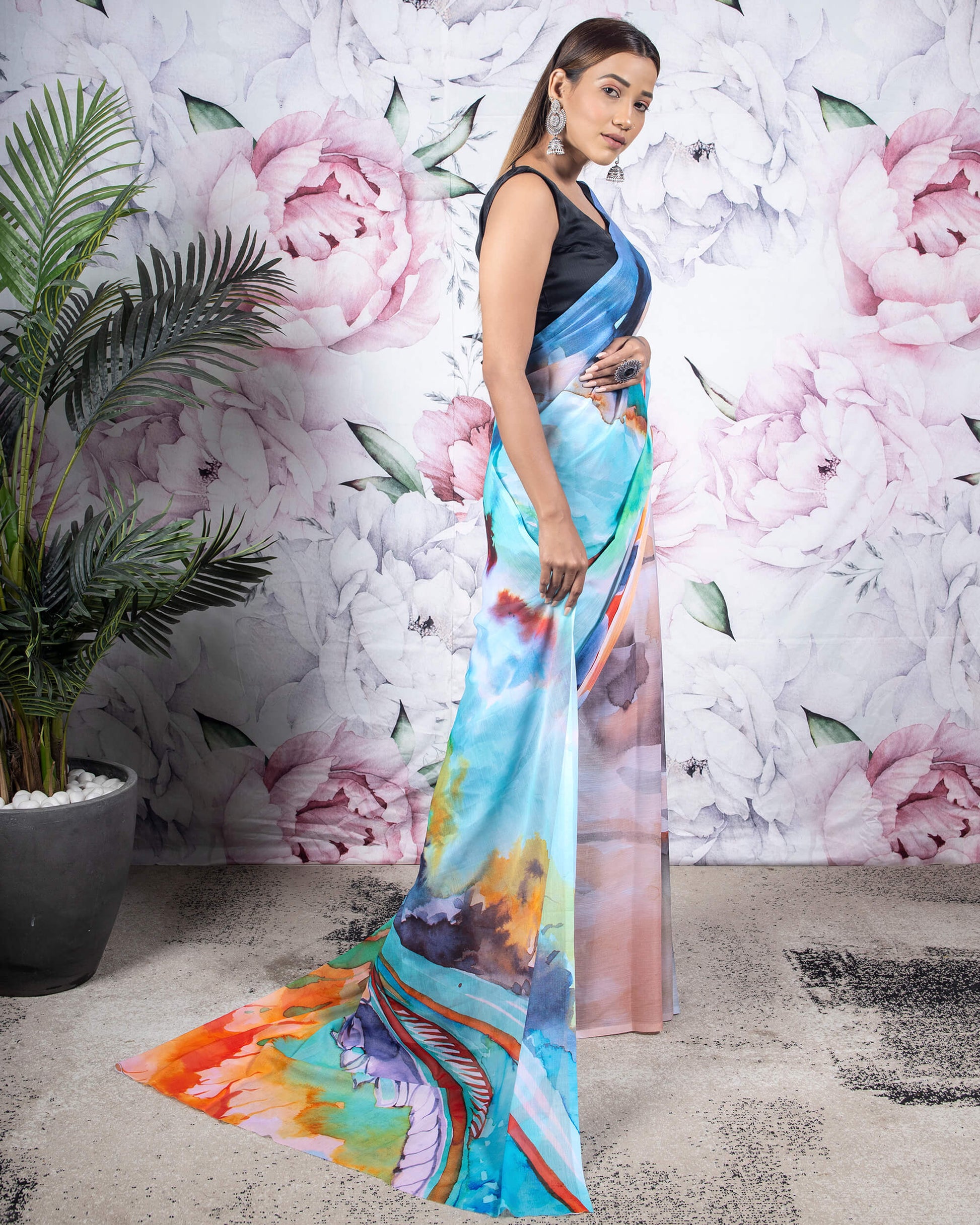 Sky Blue And Orange Abstract Pattern Digital Print Chiffon Saree