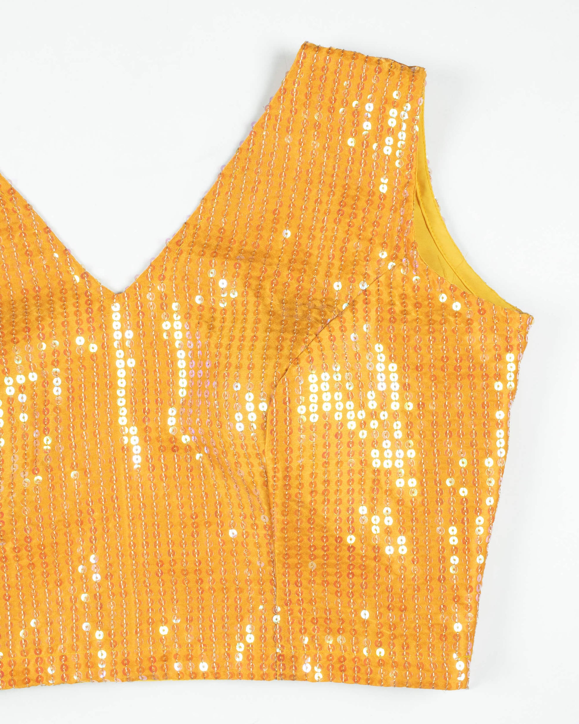 Japan Satin Blouse with Rainbow Sequins Embroidery appears astonishing. It features V- neckline, side zip closure, blouse pads, and is sleeveless. This fabric is durable and wrinkle-resistant. This blouse matched with the perfect saree brings out the best look in you.