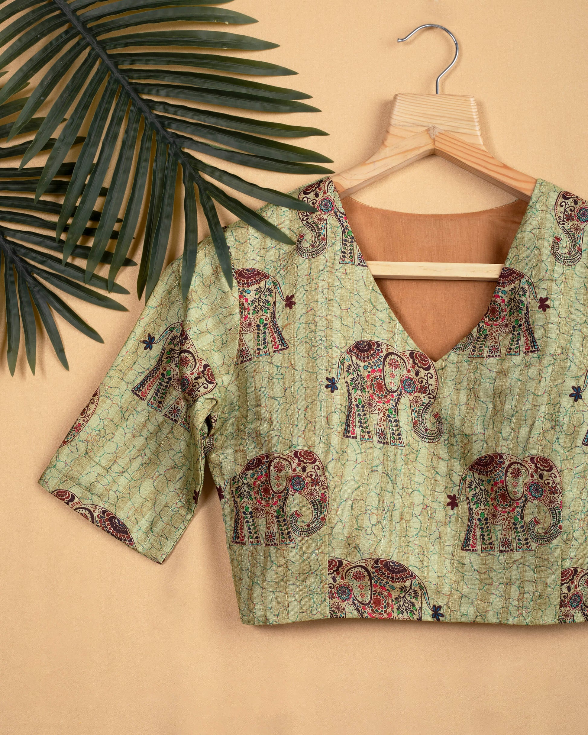 Art Tusser Silk Blouse looks sumptuous and has a fine pattern formed on it. It features a back hook, sleeveless and has a round neckline. This fabric is soft, luxrious and gives you a royal feeling. Match it with your favorite saree and this blouse won't disappoint you.