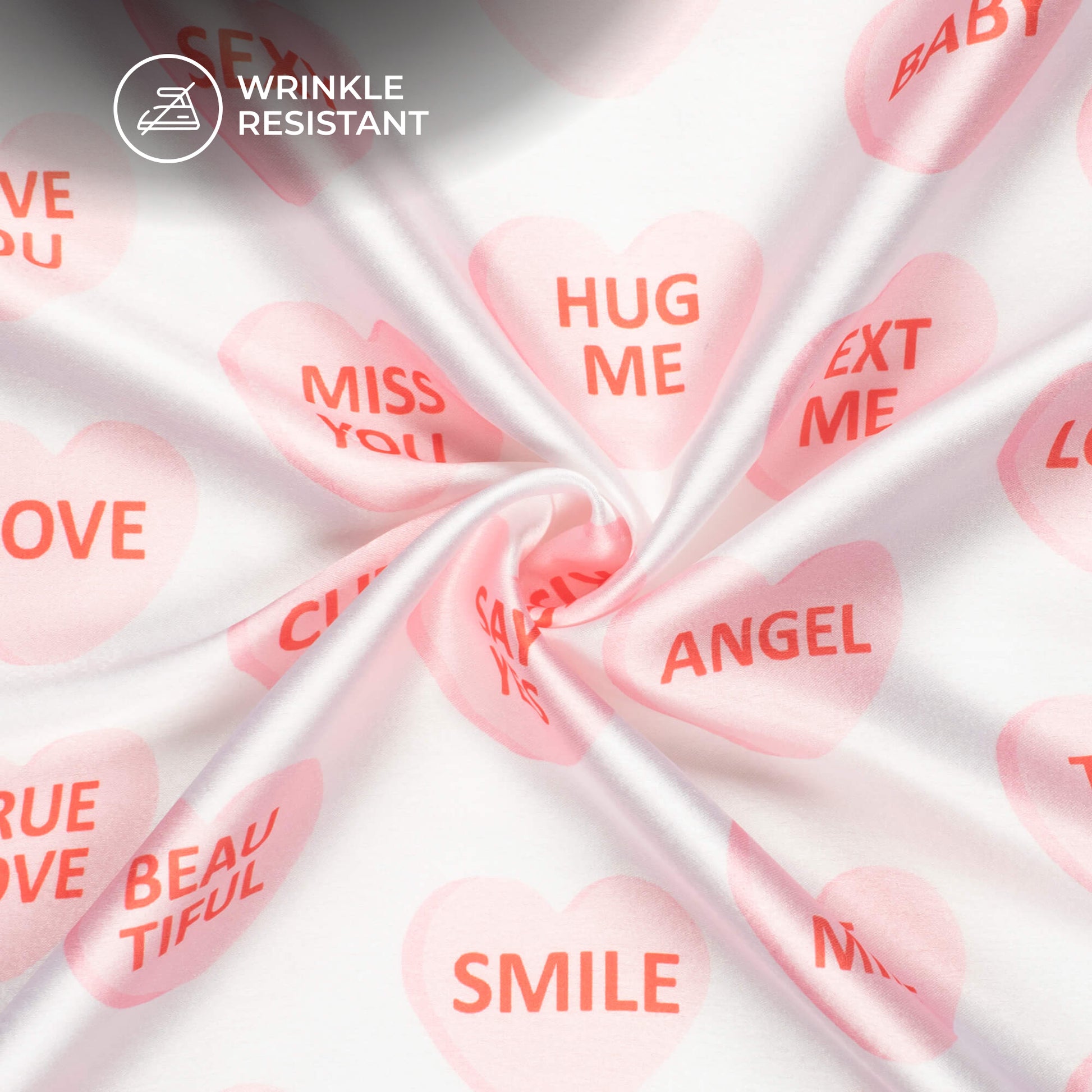 Pink Heart And Quirky Printed Japan Satin Fabric