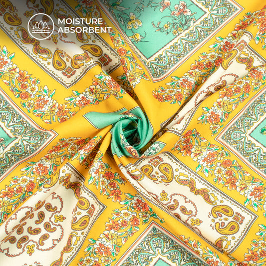 Bumblebee Yellow And Persian Green Quirky Pattern Digital Print Viscose Rayon Fabric (Width 58 Inches) Bumblebee Yellow And Persian Green Quirky Pattern Digital Print Viscose Rayon Fabric (Width 58 Inches)