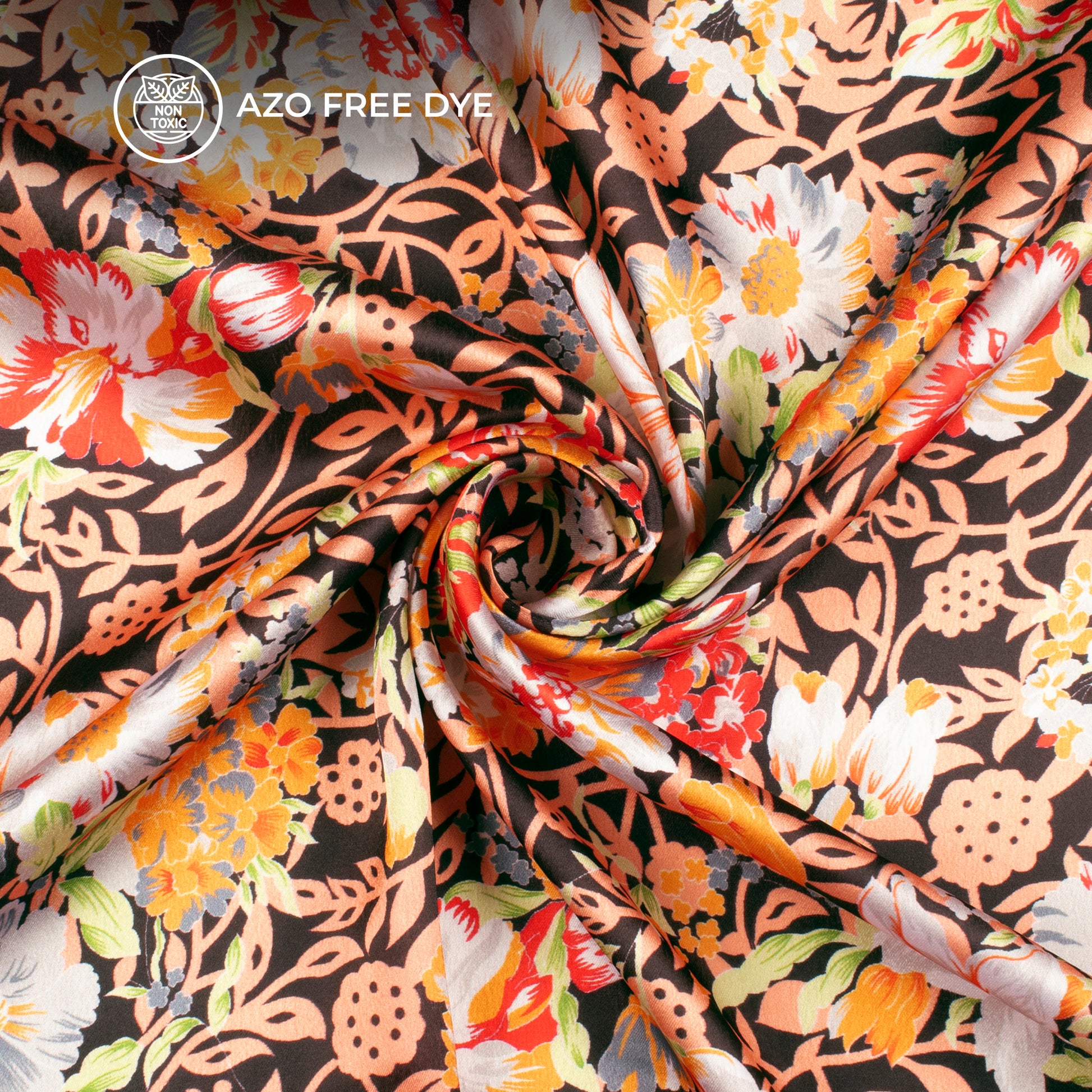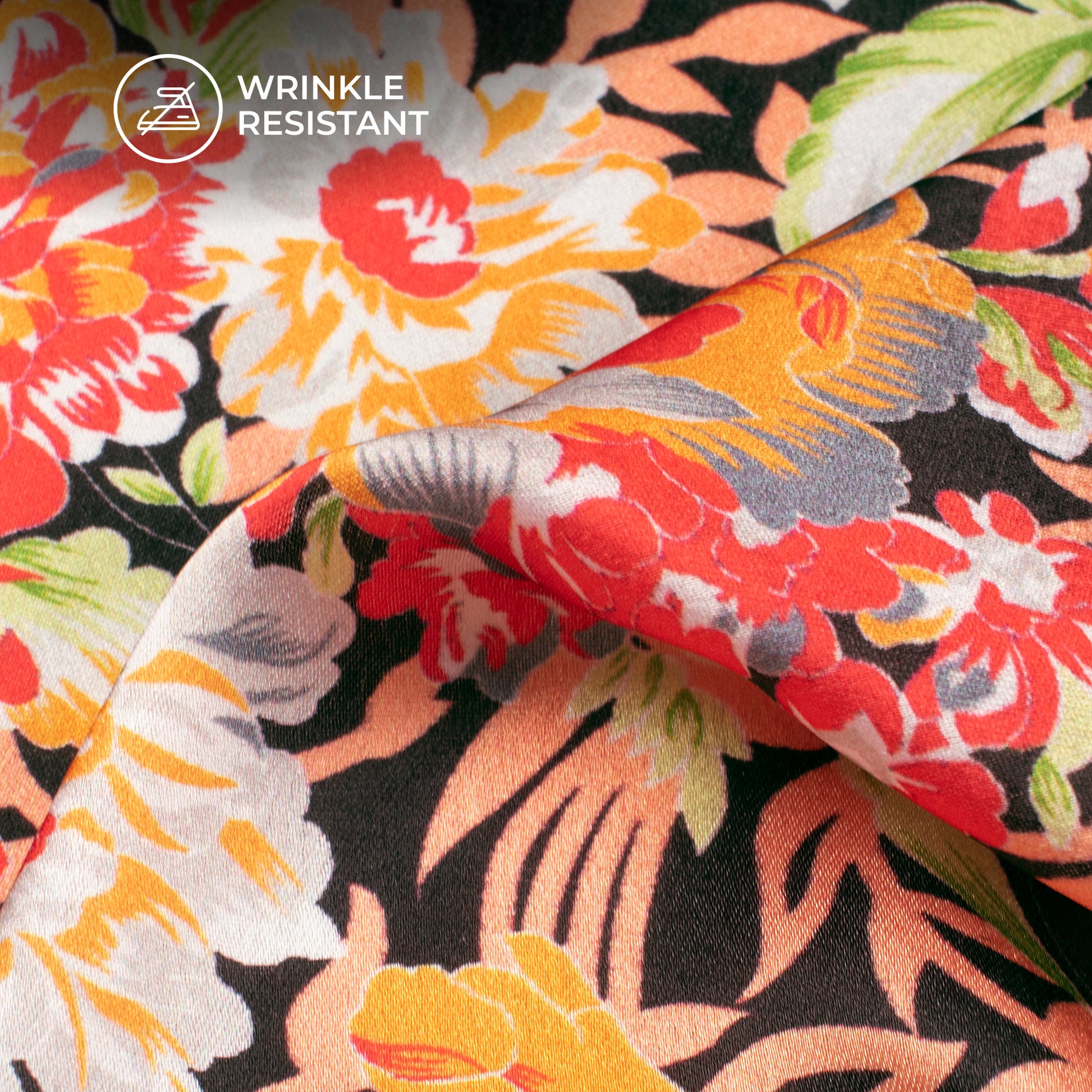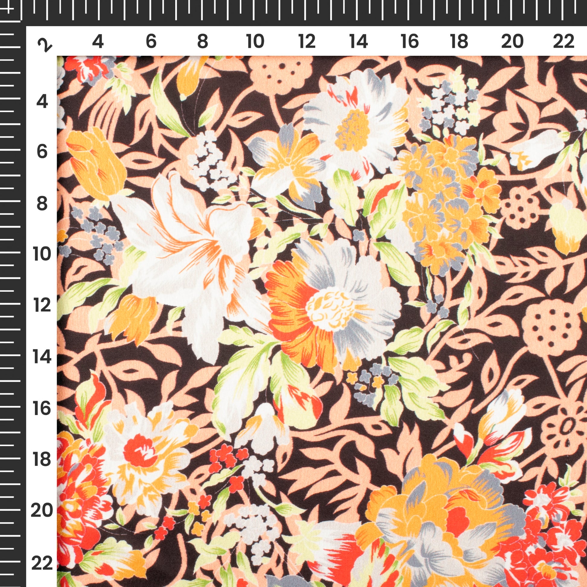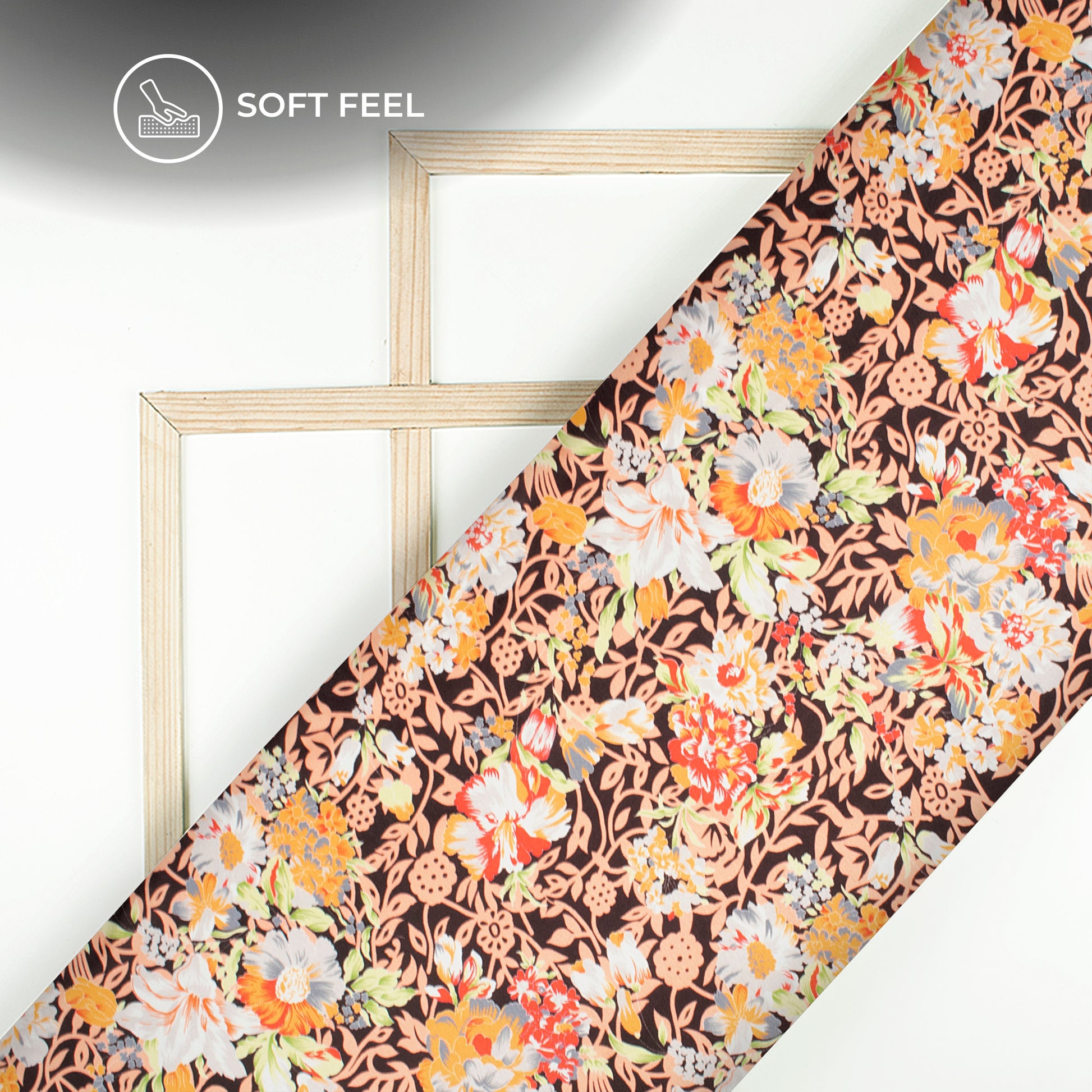 Black And Peach Floral Digital Print Japan Satin Fabric