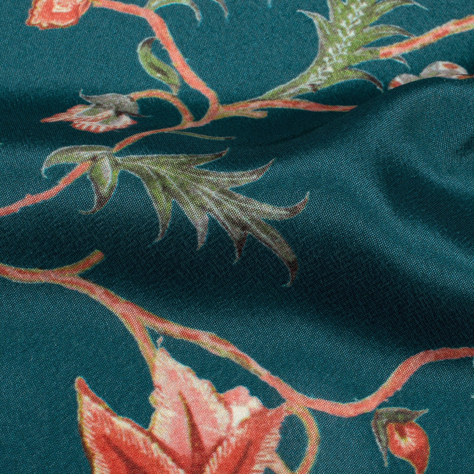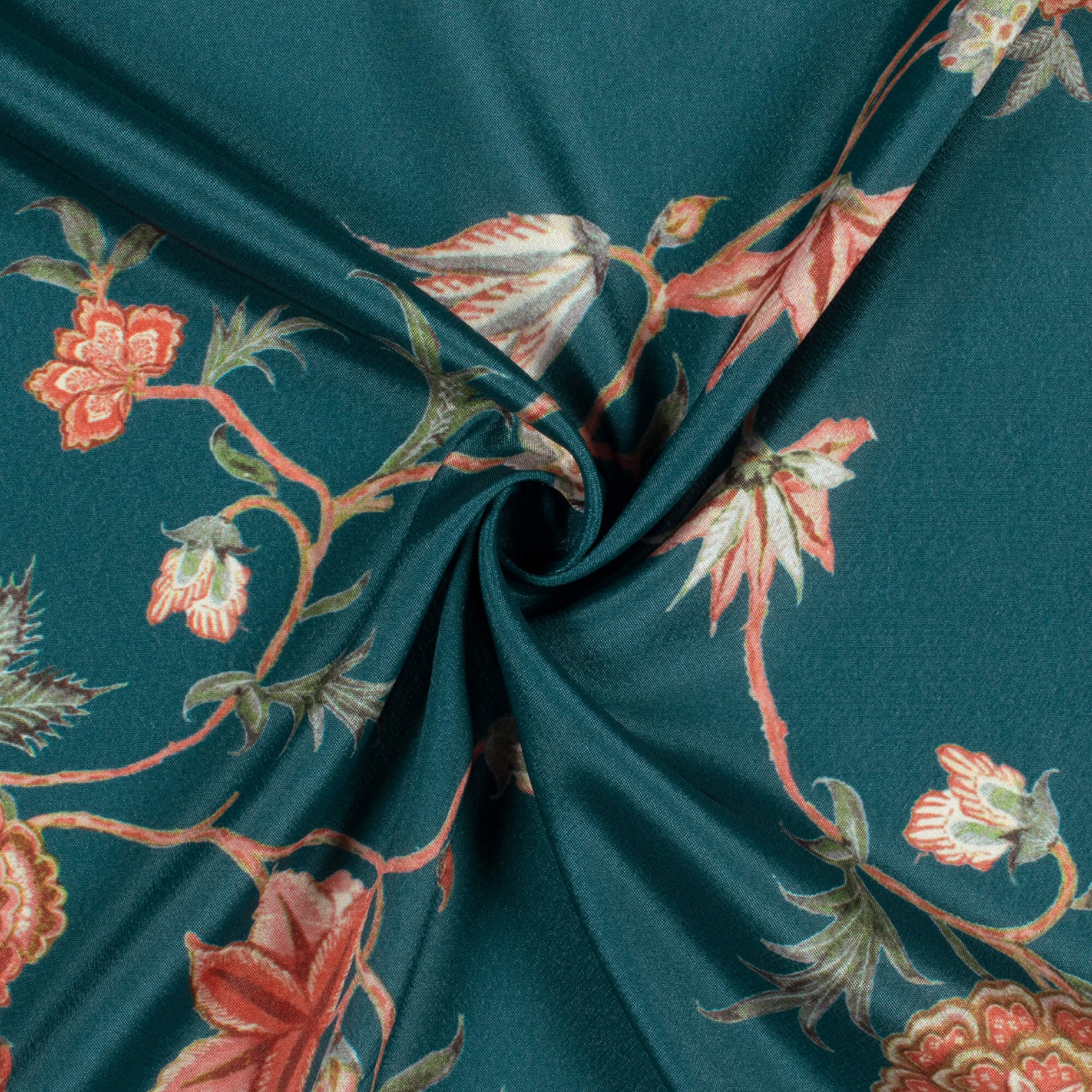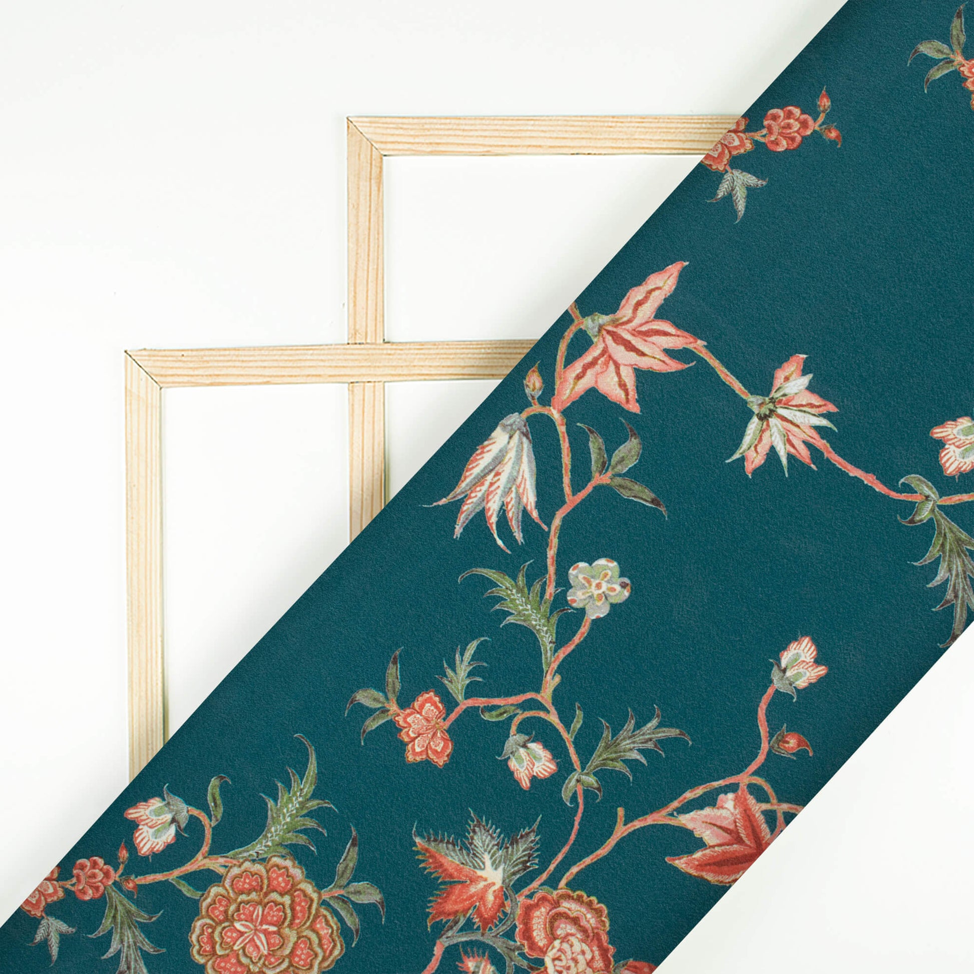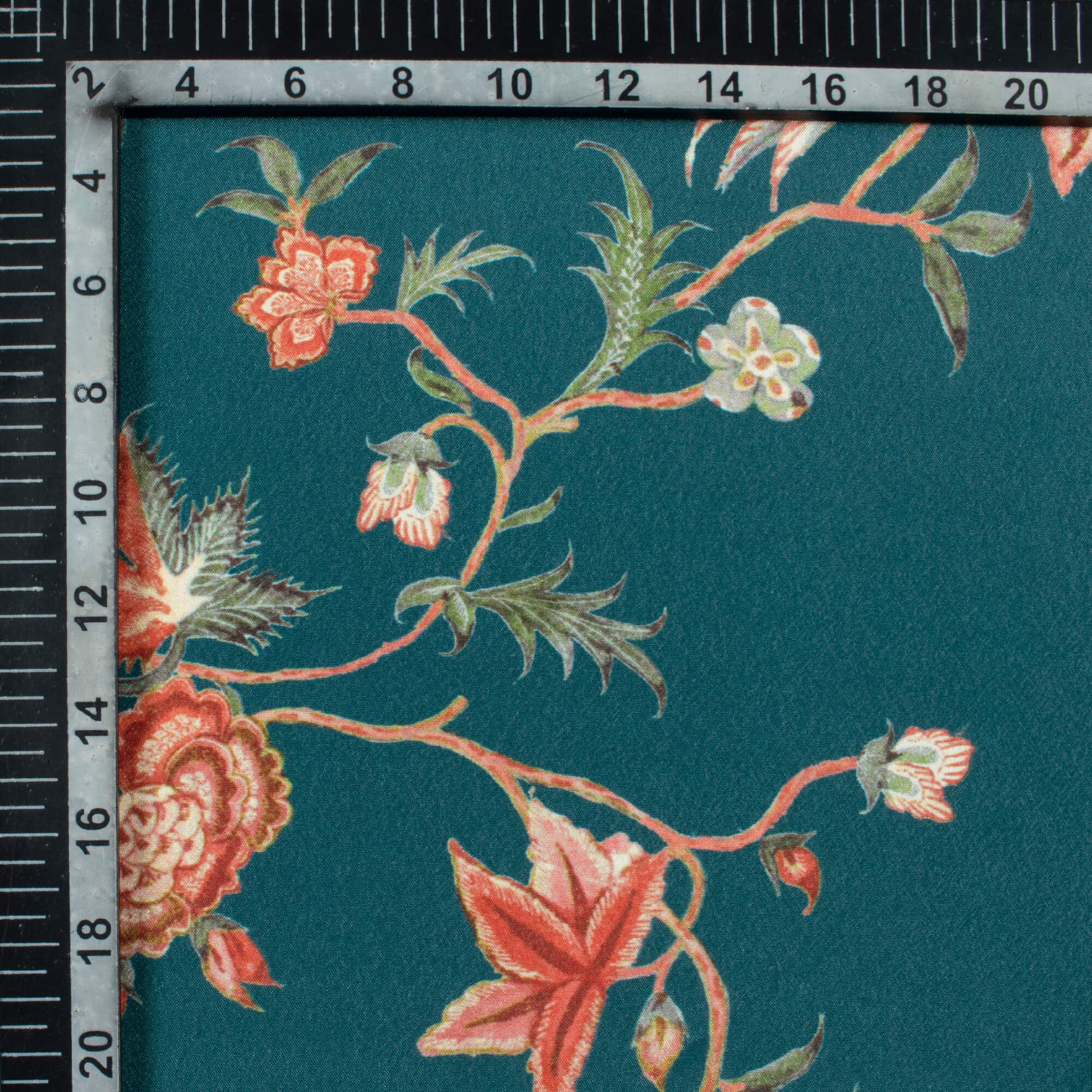 Peacock Blue And Red Floral Pattern Digital Print Crepe Silk Fabric
