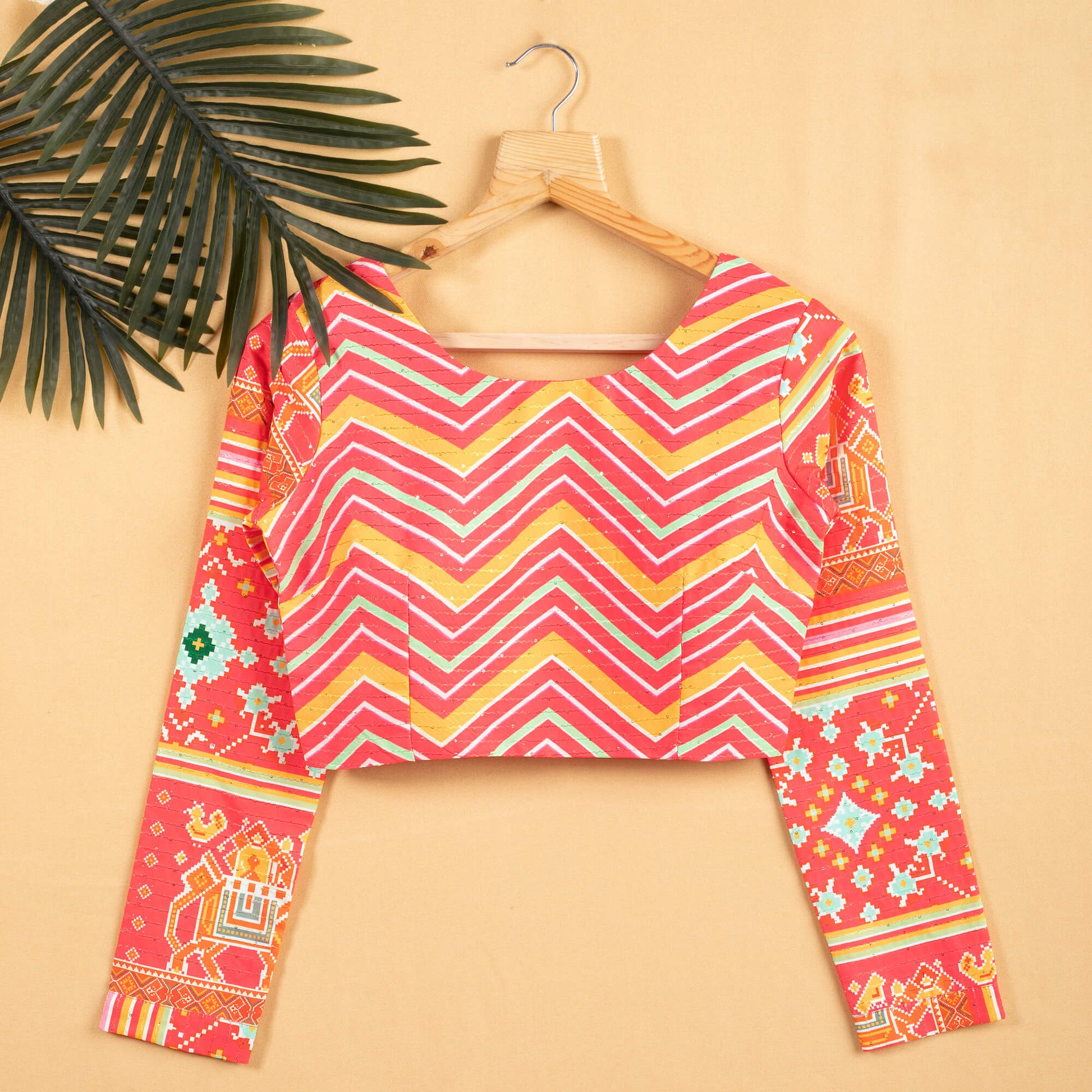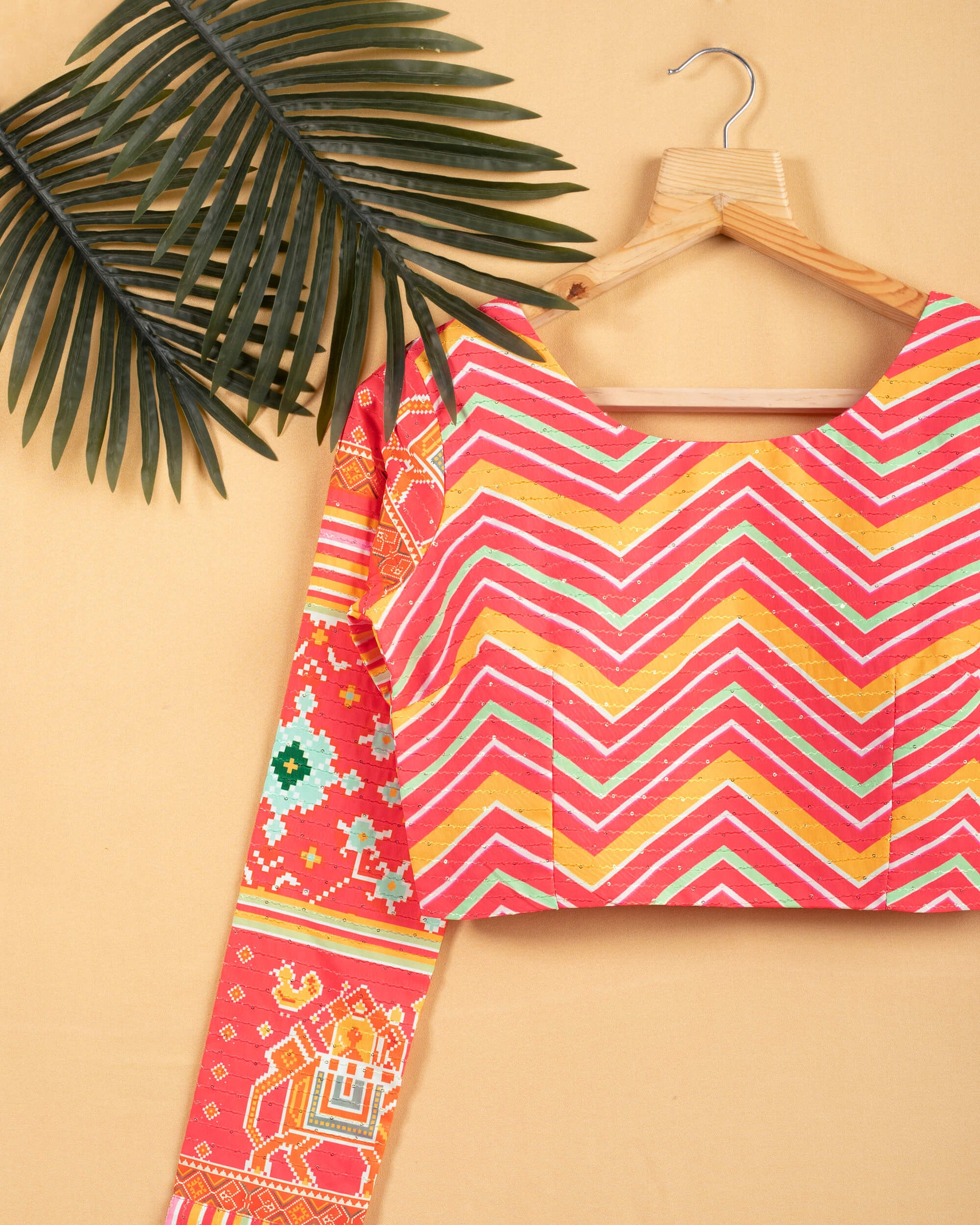 Blouse in Chevron pattern looks wonderful. It features Round-neckline and is full sleeve. The fabric is soft and lightweight making it comfortable to wear. Suit this blouse with a saree and arrive in style.
