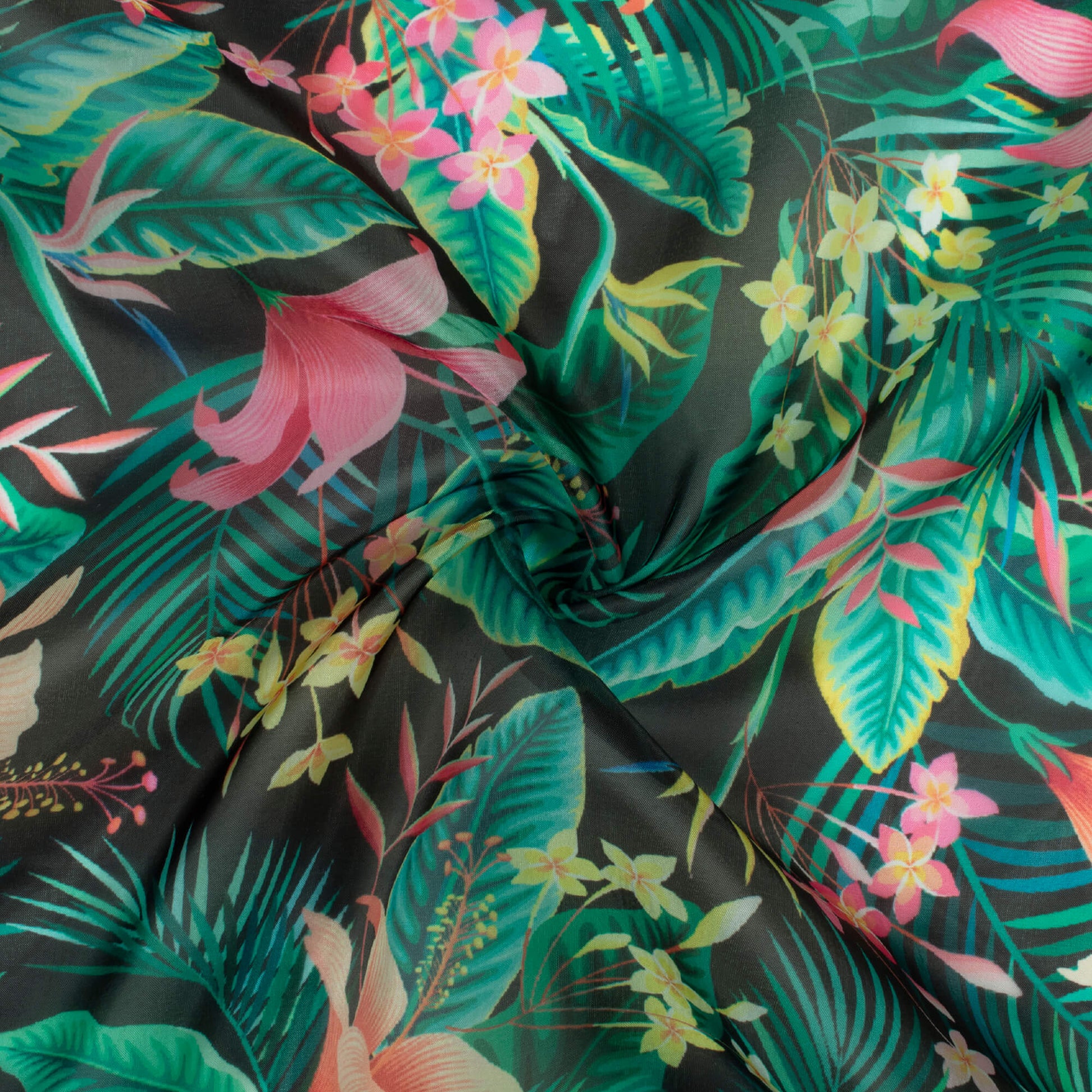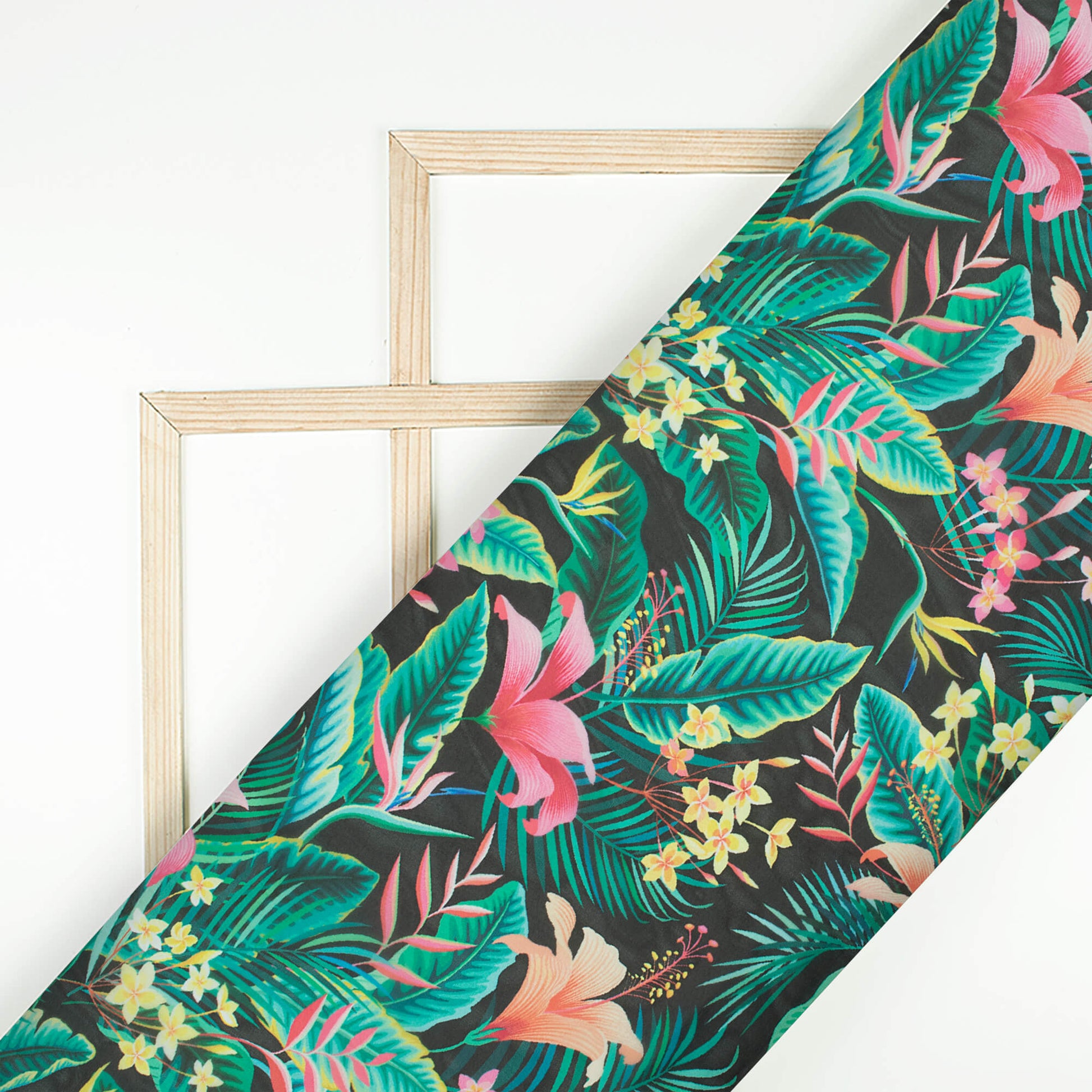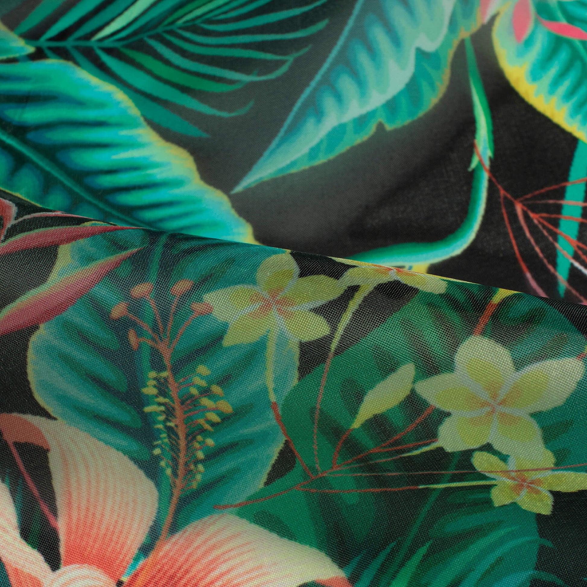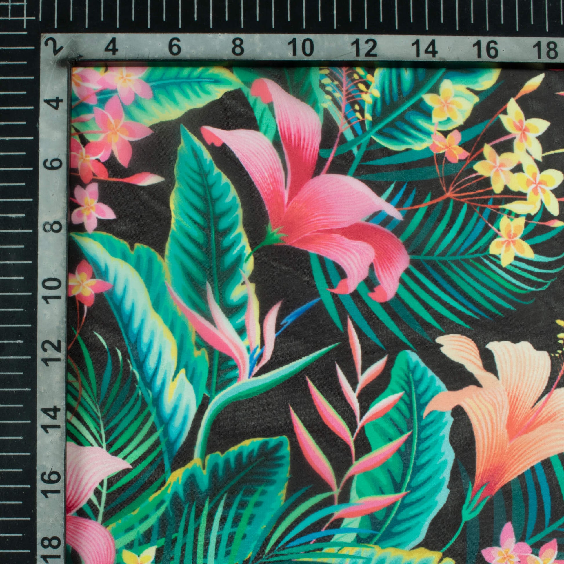 Black And Taffy Pink Tropical Pattern Digital Print Organza Satin Fabric