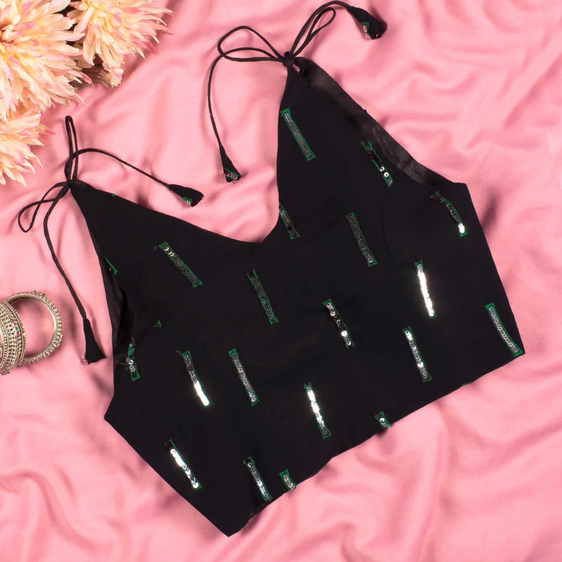 Green Sequins Georgette Spaghetti Tie Up Blouse
