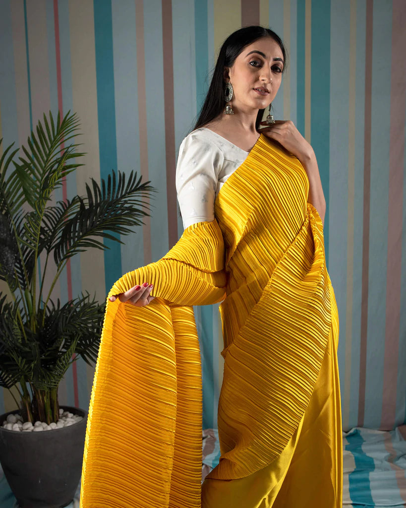 Mustard Yellow Plain Half Pleated Japan Satin Saree