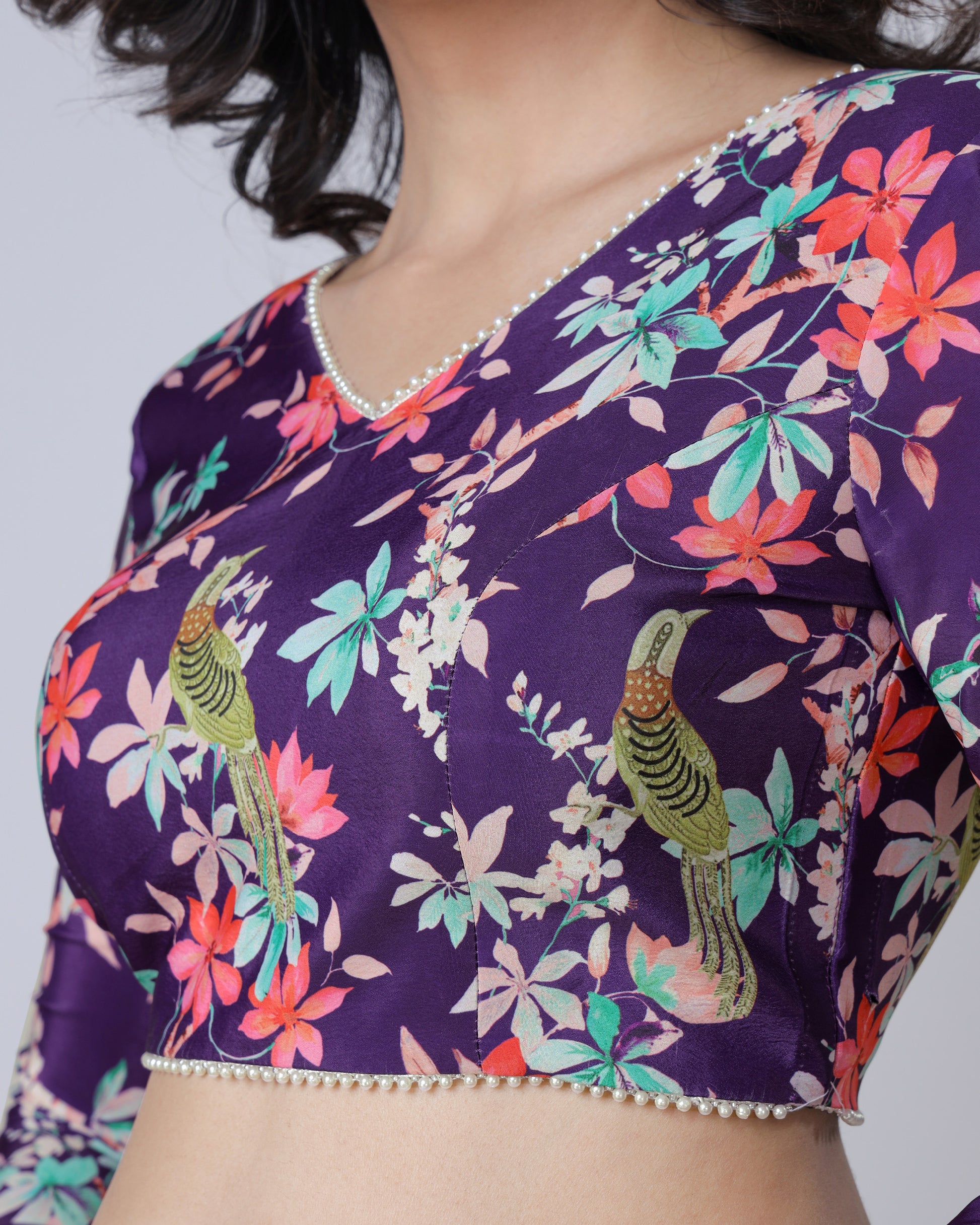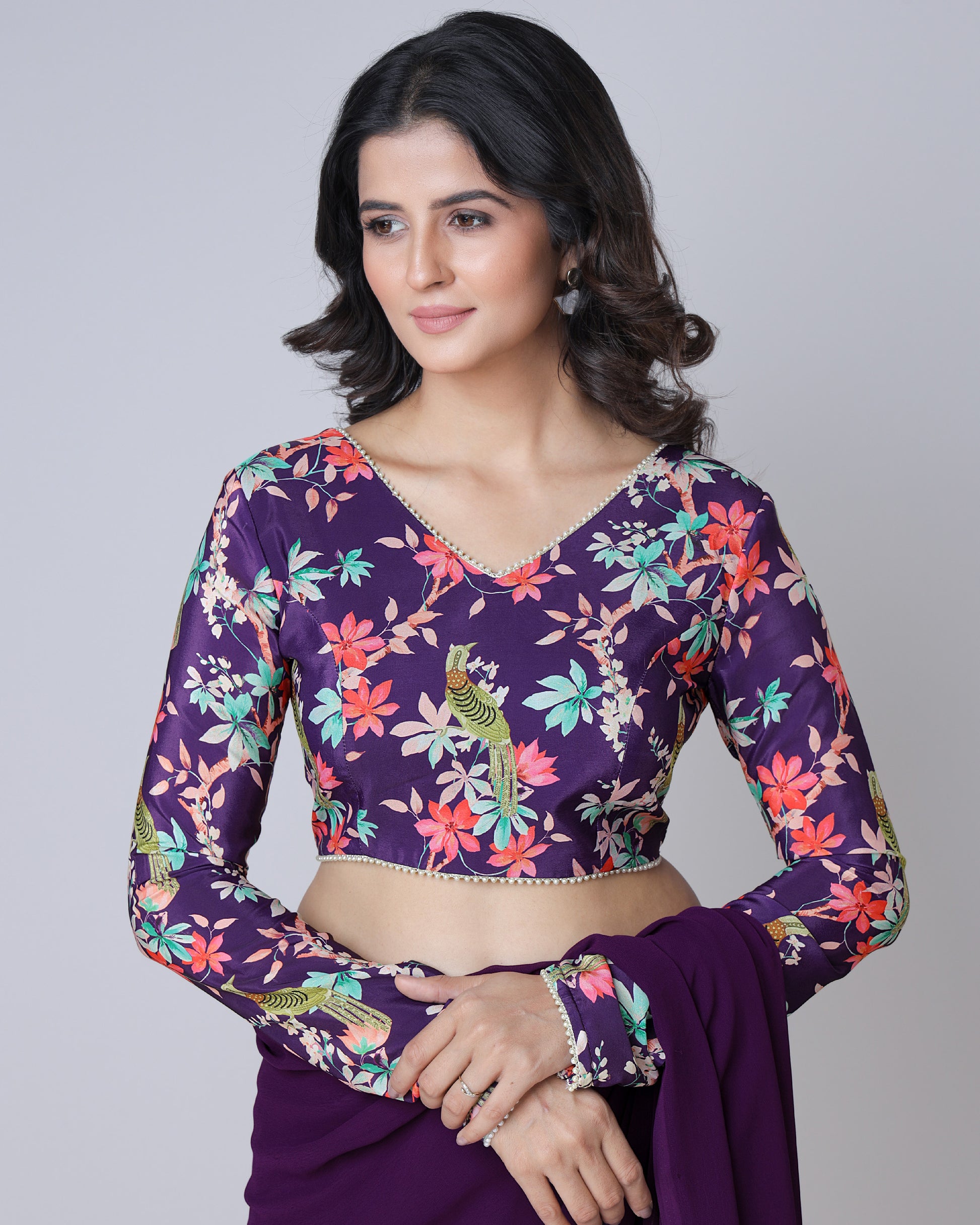 Purple Vintage Floral Full Sleeve Laced Silk Blouse