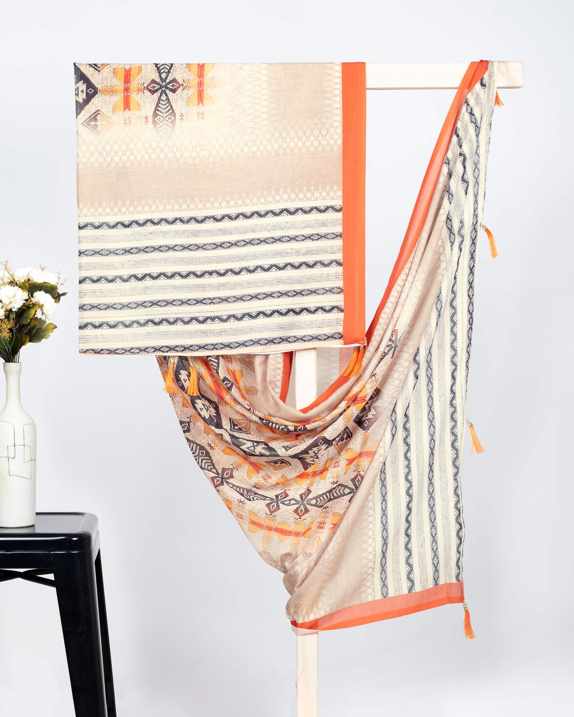 Tan Beige And Black Chevron Pattern Digital Print Poly Voile Dupatta With Tassels